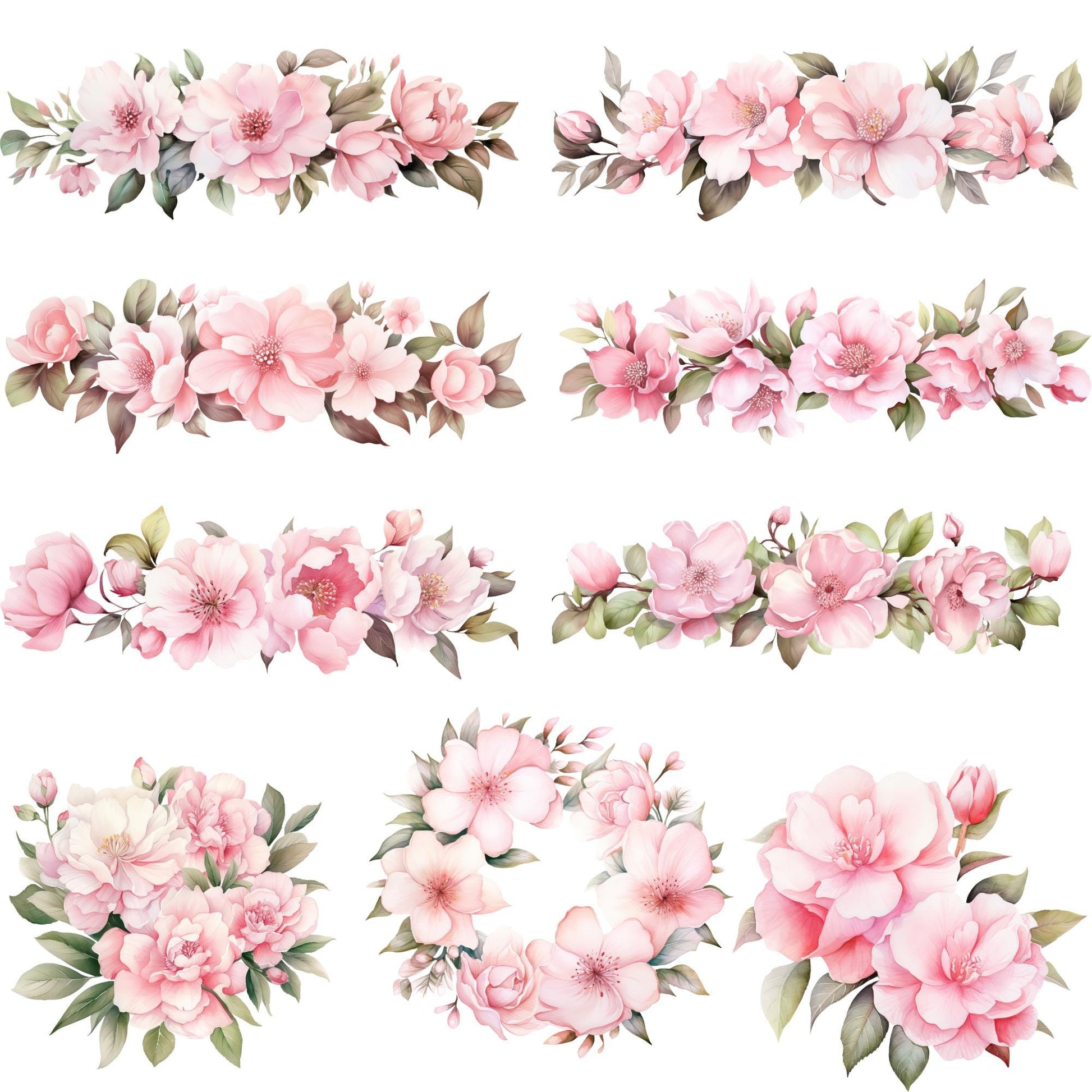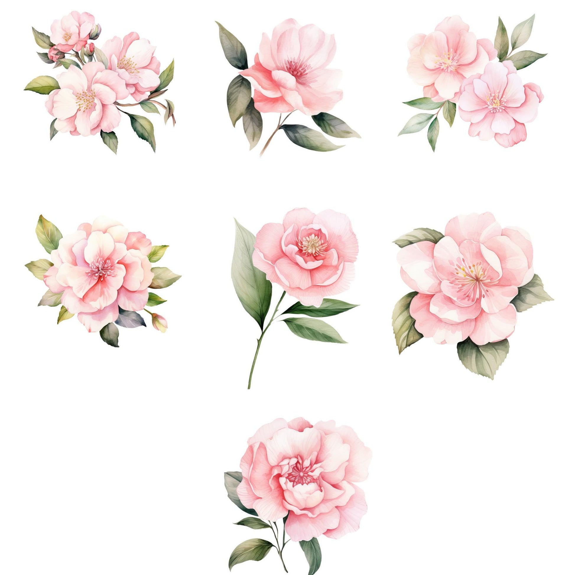 Discover the beauty of spring with our Pink Camellias Clipart. Perfect for creating stunning wedding invitations, party printables, and more. This watercolor floral bundle is available for commercial use.