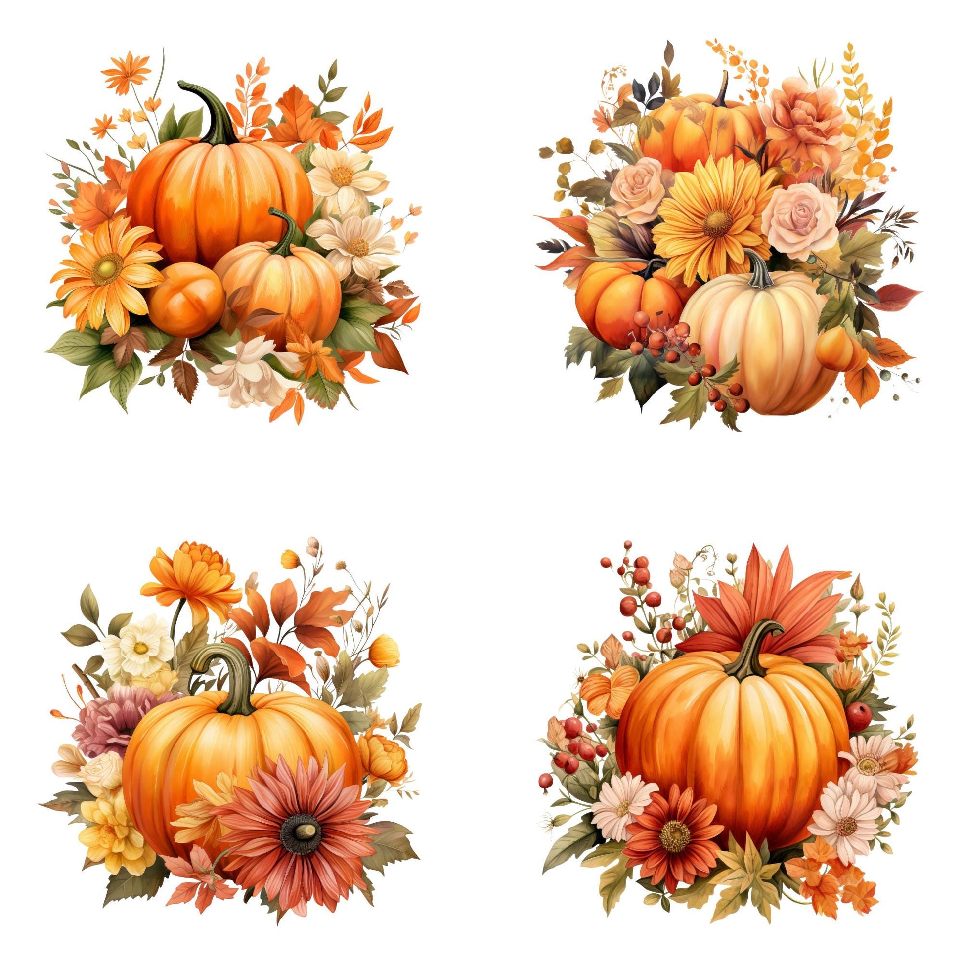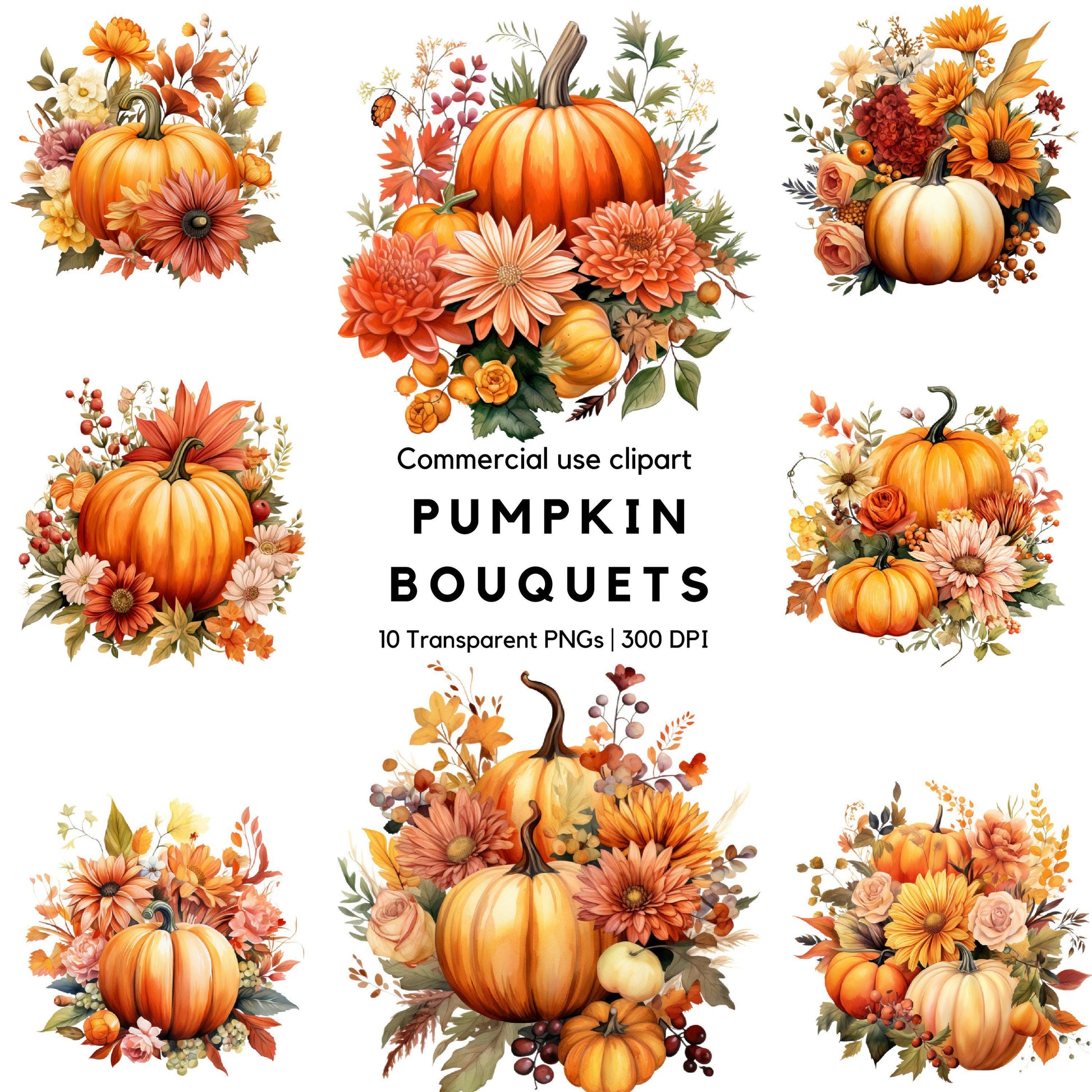Elevate your autumn projects with our Watercolor Pumpkin Bouquet Clipart pack! This stunning collection features a variety of watercolor pumpkins adorned with vibrant autumn flowers. Perfect for Thanksgiving, fall decor, and seasonal crafts. Ideal for both personal and commercial use, these high-quality PNG files will add a touch of autumn elegance to your designs.