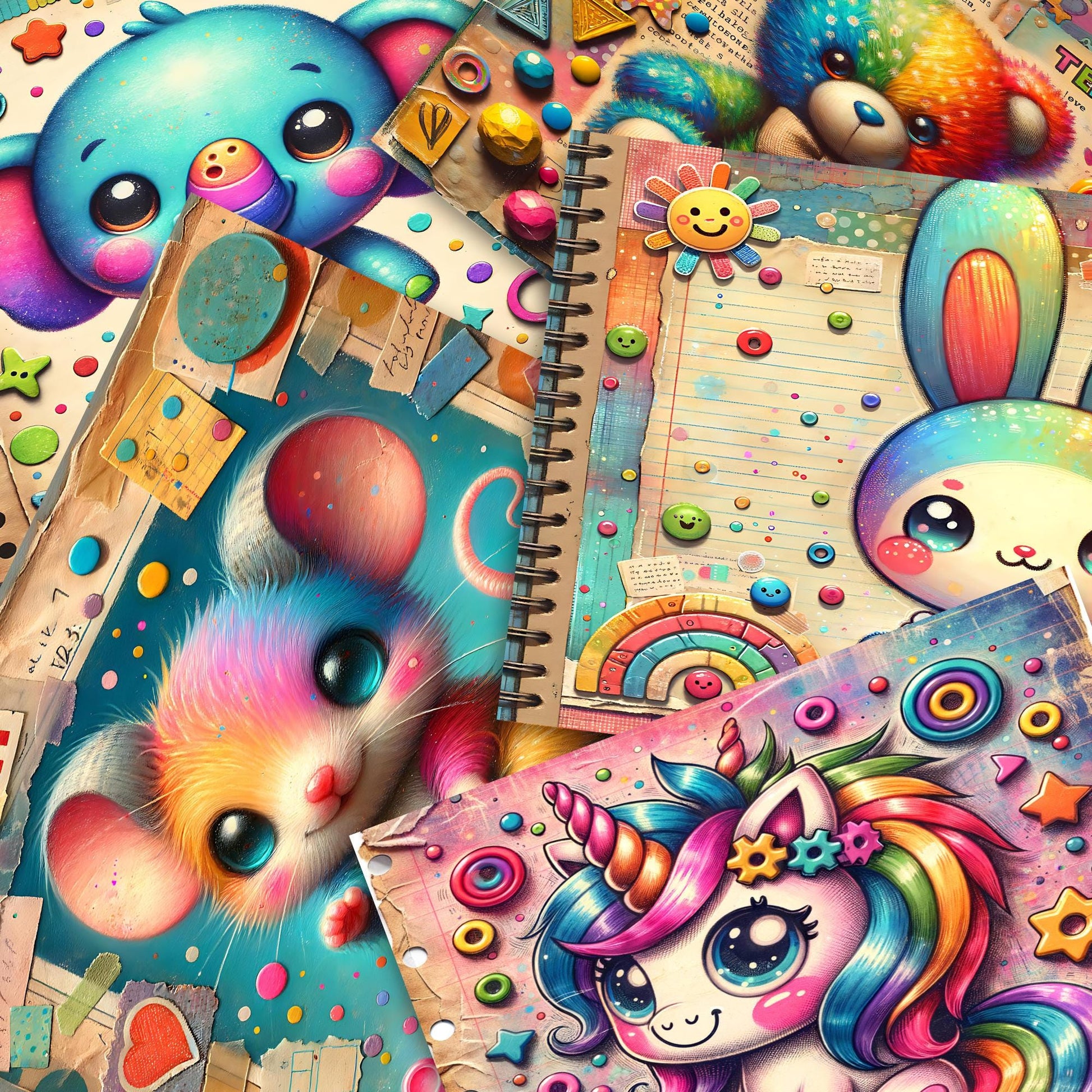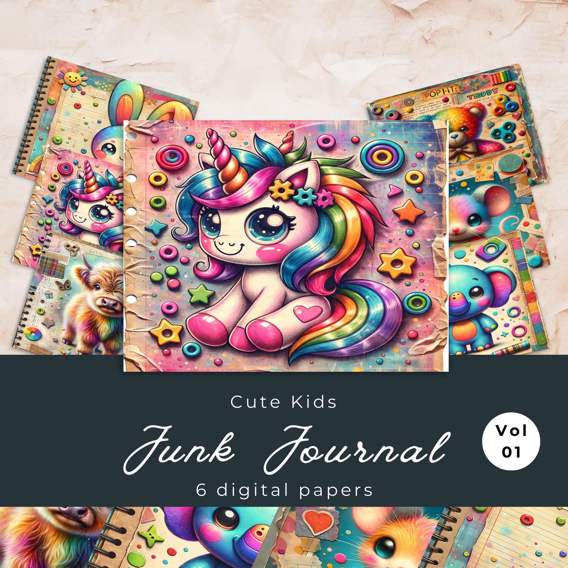 Dale alegría y creatividad a tus proyectos con este adorable papel para diarios infantiles. Perfecto para guarderías, diarios infantiles y diseños alegres de scrapbooking, este set de papel digital presenta patrones coloridos y divertidos, ideales para crear diarios infantiles, efímeras y mucho más.