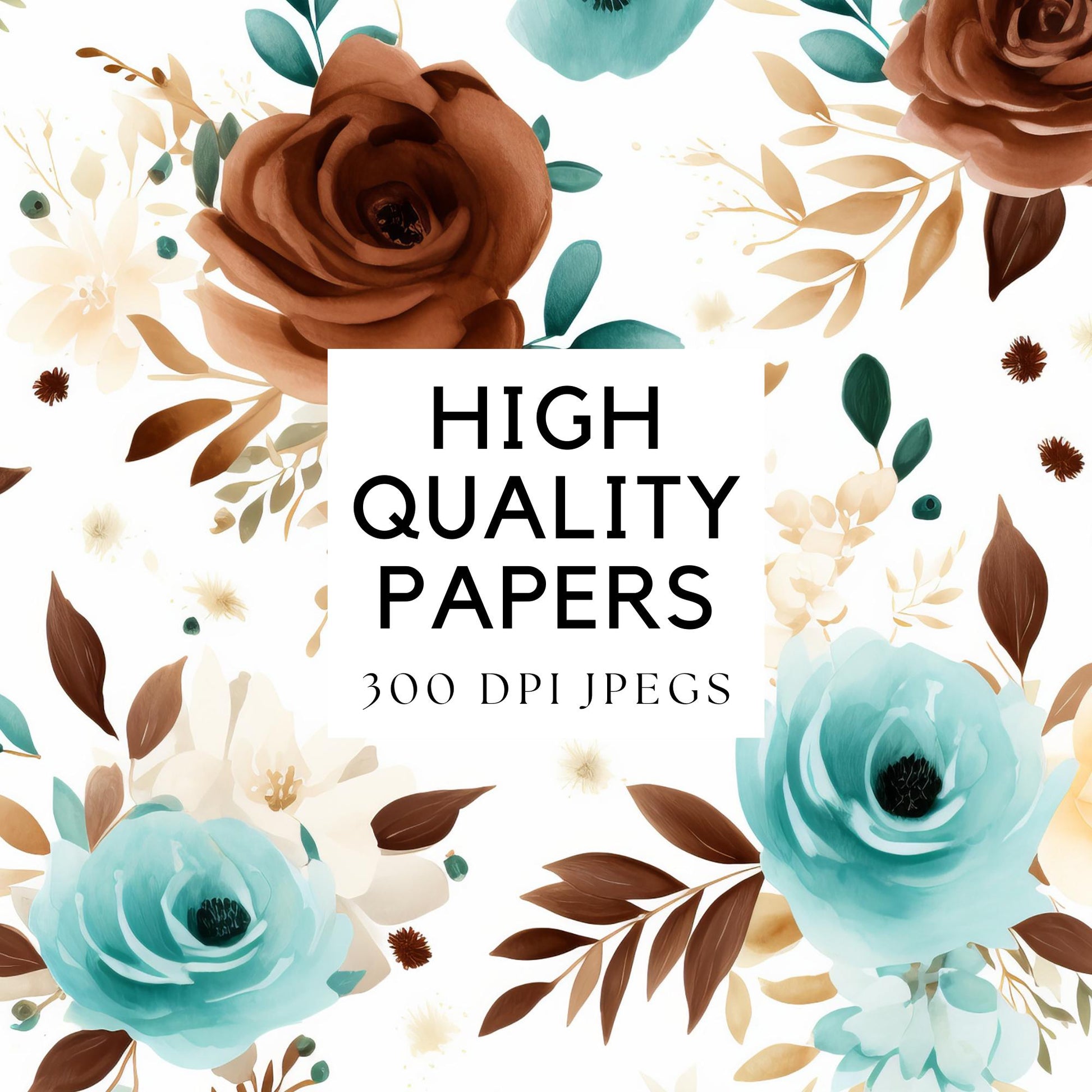 Papeles digitales florales en tonos verde azulado y marrón chocolate