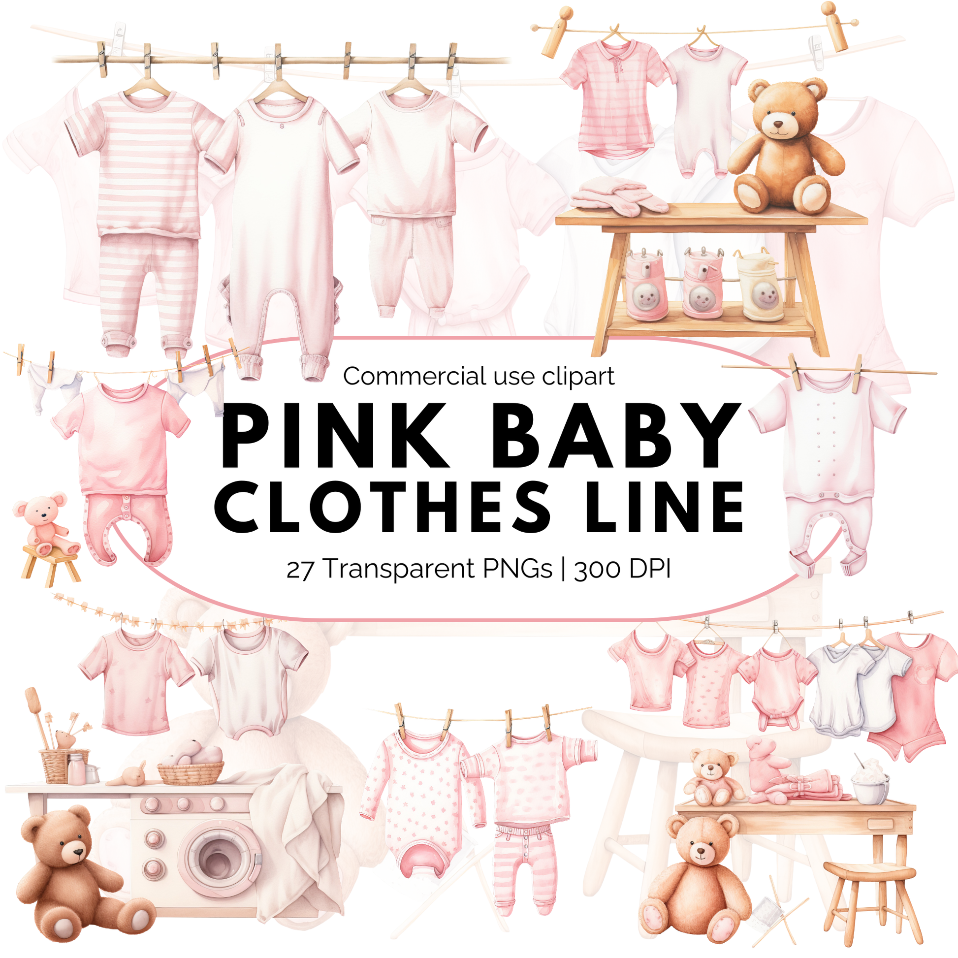 Bienvenidos a nuestra encantadora línea de ropa de bebé en acuarela - Pack rosa, ¡perfecta para añadir un toque de fantasía a tus invitaciones de baby shower, decoración infantil o invitaciones de cumpleaños! Este encantador set incluye adorables imágenes prediseñadas para baby shower, todas en un encantador estilo acuarela.