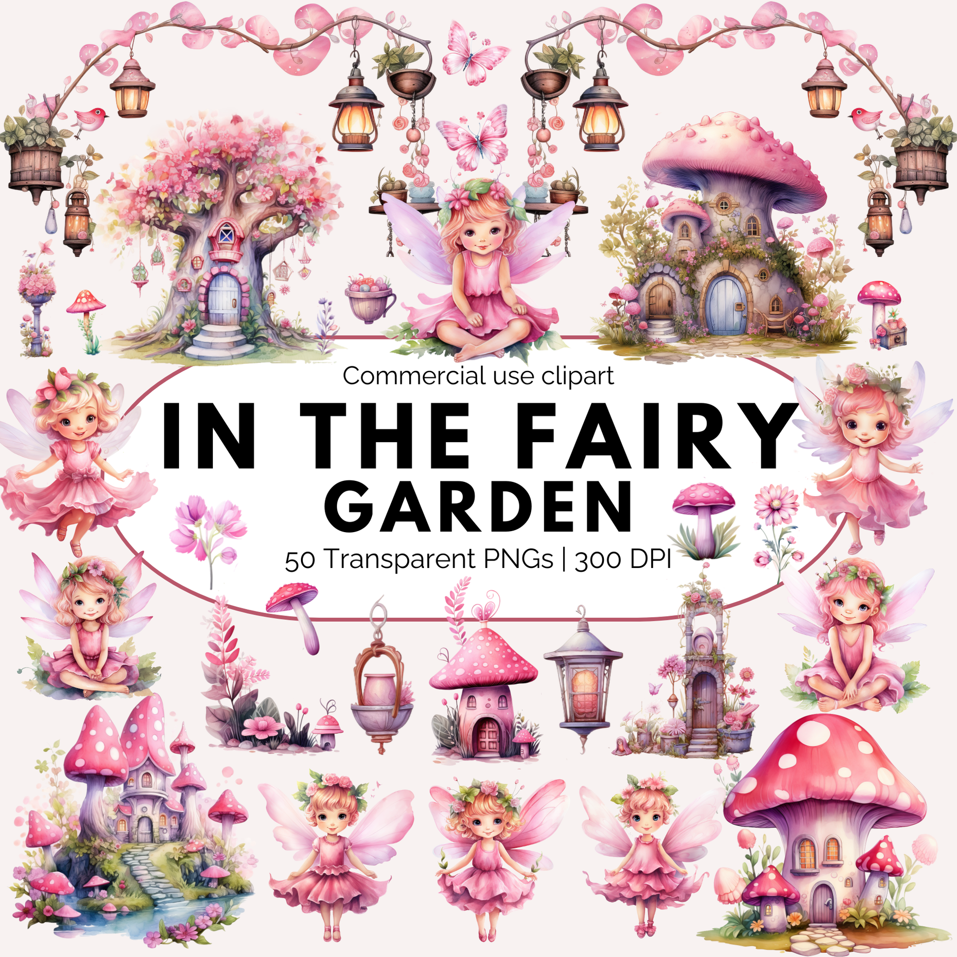 Adéntrate en el Jardín Encantado con nuestro clipart de Jardín de Hadas en Acuarela. ¡Con hadas rosas, adorables casitas de hadas, pequeños hongos y adornos mágicos!
