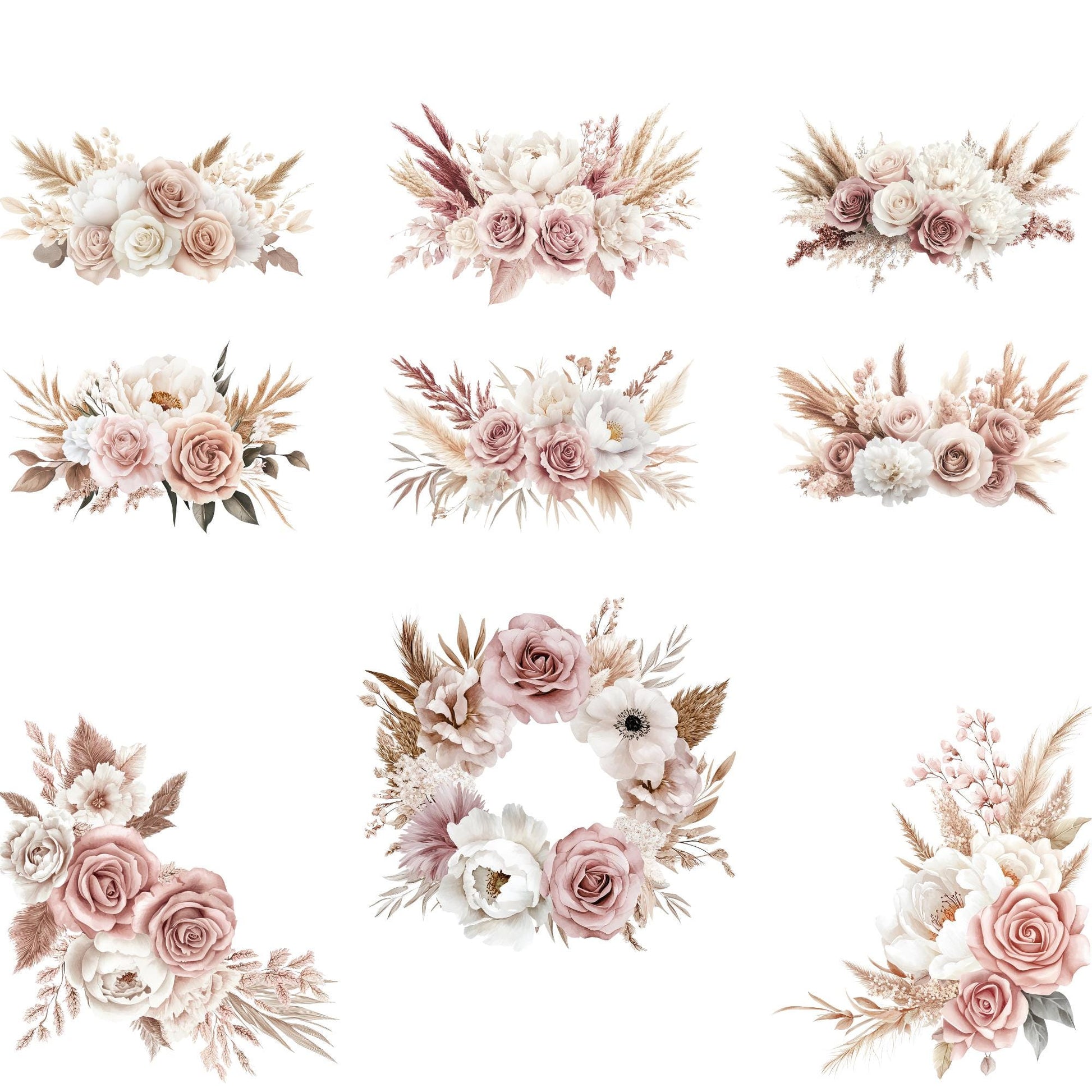 Crea diseños impresionantes con este hermoso set de imágenes prediseñadas de flores de la pampa rosa. Perfectos para añadir un toque de elegancia bohemia a tus proyectos, estos elementos de acuarela de flores y hierba de la pampa están diseñados para brindar una estética suave y soñadora. Ideales para invitaciones de boda, branding, papelería y más, este paquete de 29 PNG transparentes de alta calidad garantiza que tu creatividad fluya sin esfuerzo.