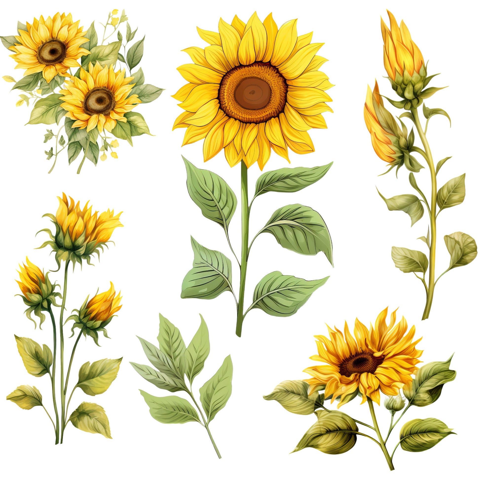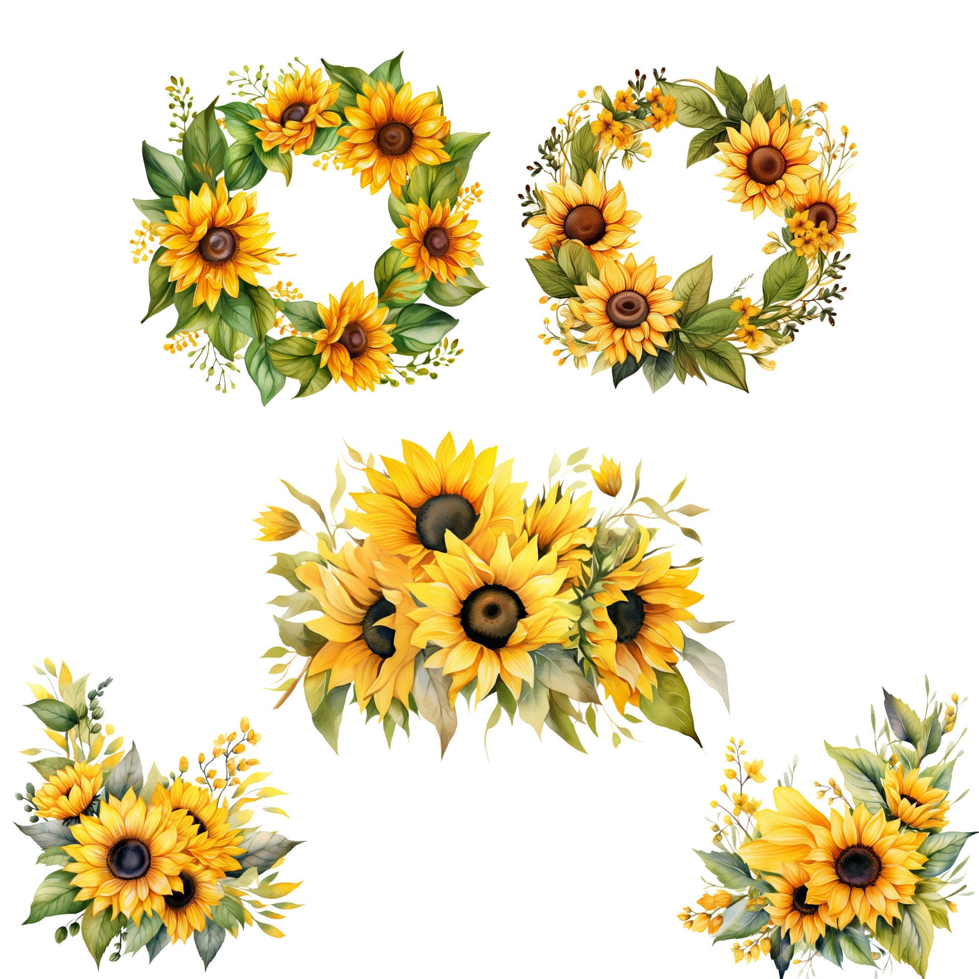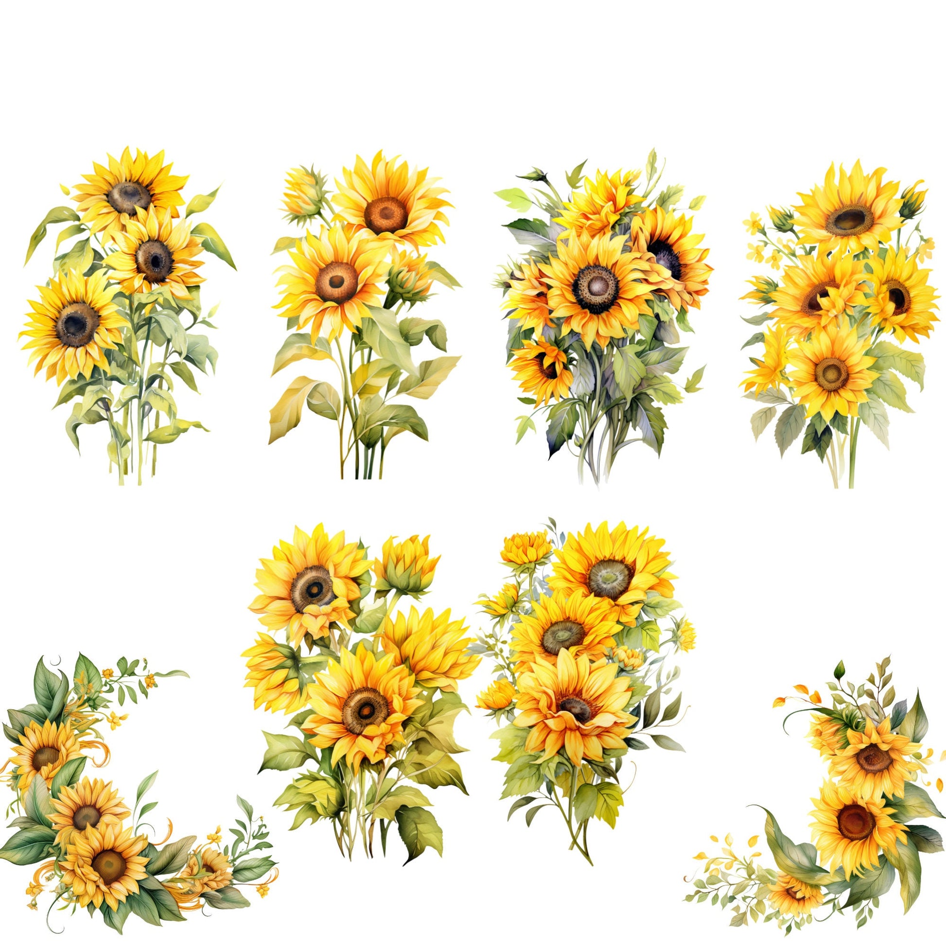 ¡Incorpora la vibrante belleza de los girasoles a tus proyectos digitales con nuestro impresionante paquete de imágenes prediseñadas de girasoles! Esta colección incluye exquisitas ilustraciones de girasoles en acuarela, perfectas para añadir un toque natural a tus diseños. Crea preciosos ramos, encantadoras coronas o simplemente adorna tus creaciones con estas alegres flores.