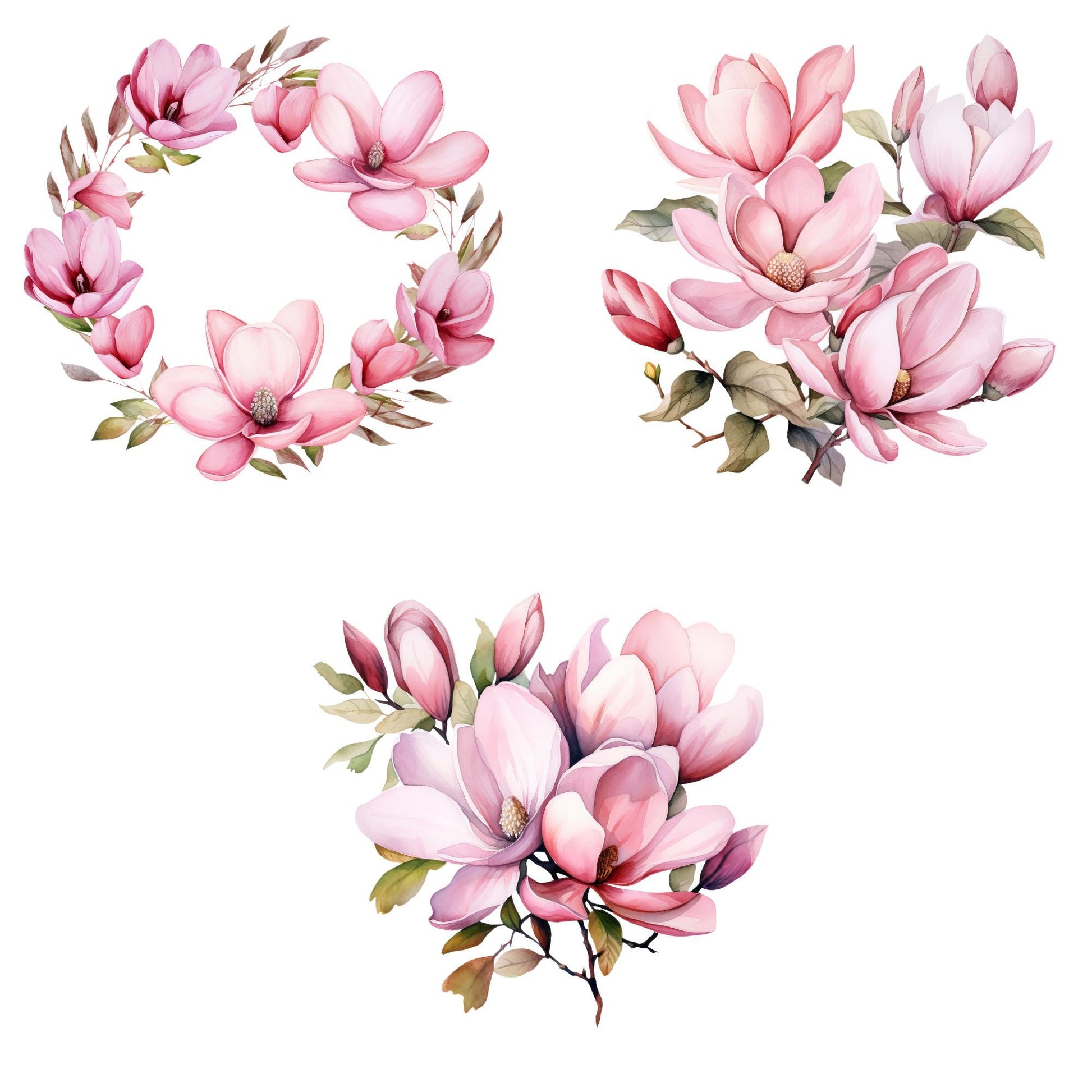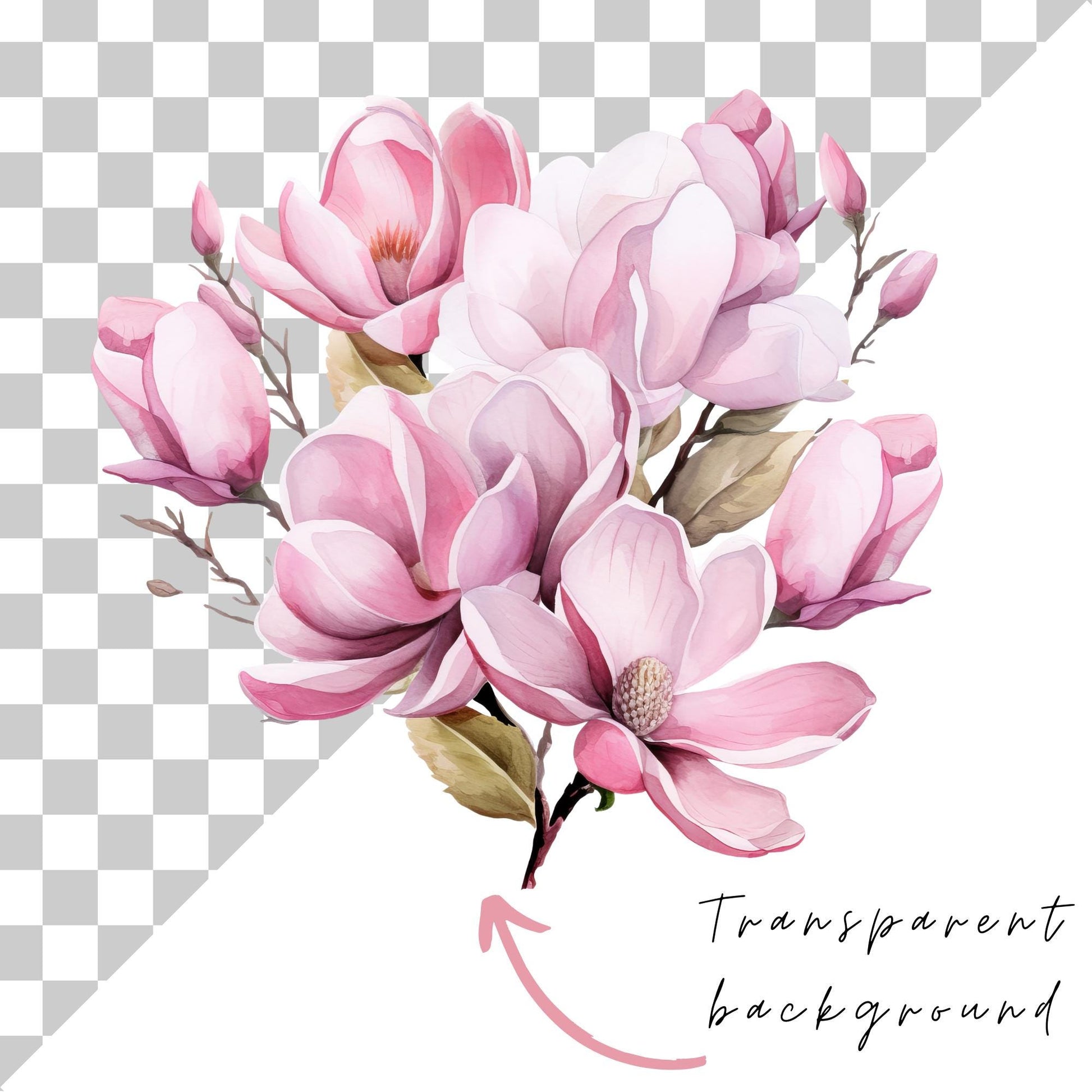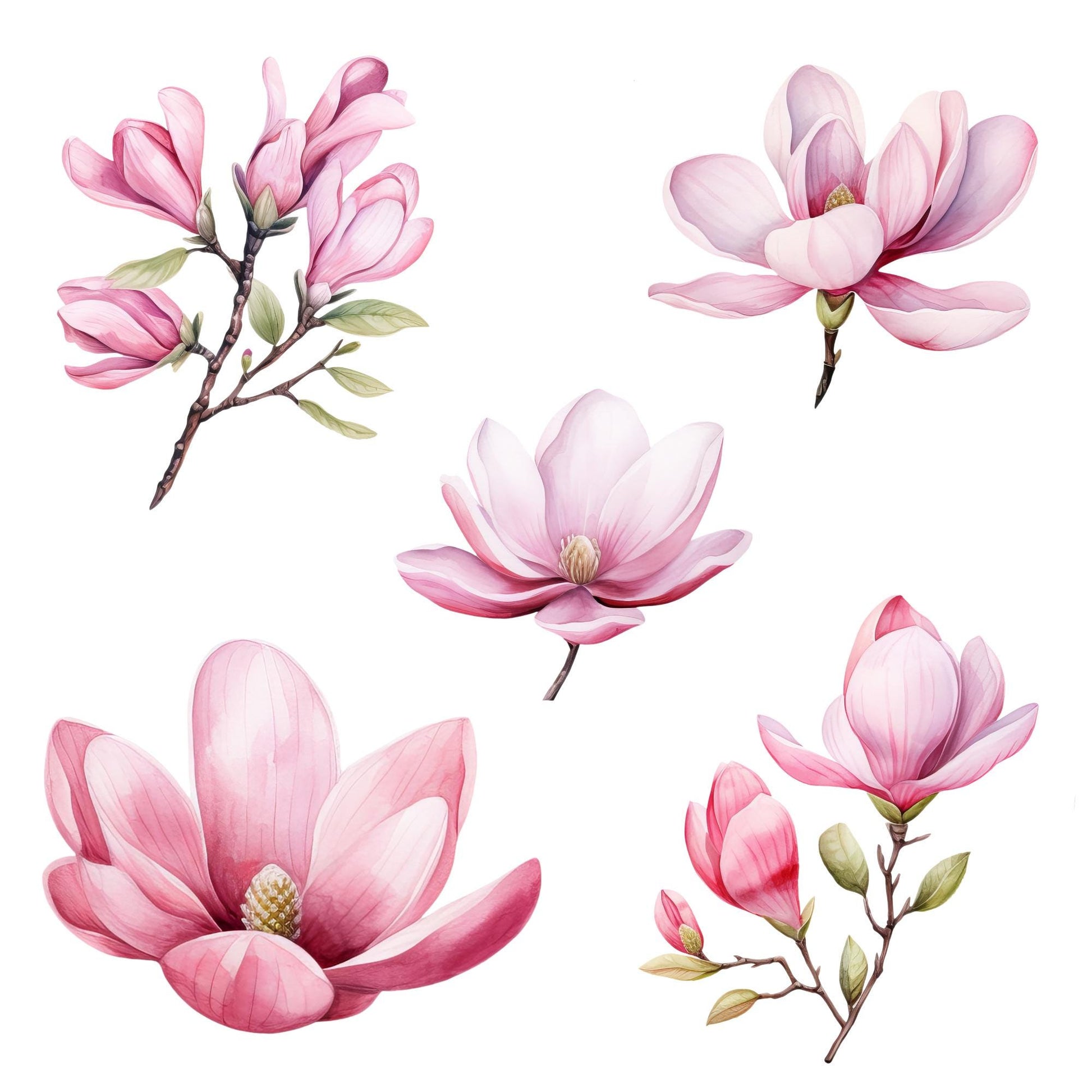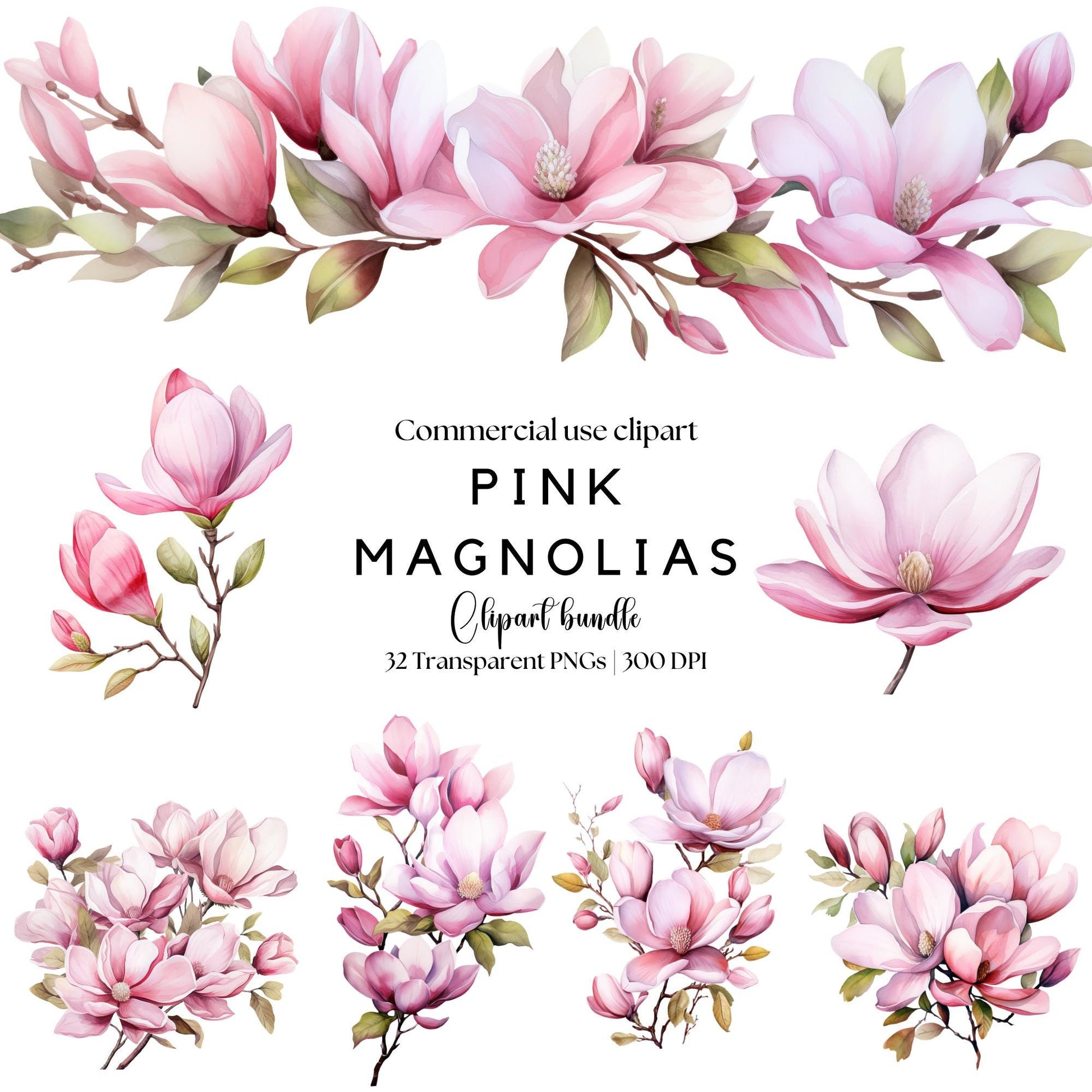 Mejora tus proyectos creativos con nuestro Clipart de Magnolia Rosa, con elegantes magnolias en acuarela, perfectas para bodas y diseños primaverales. Esta descarga digital ofrece vibrantes elementos florales rosas para un uso versátil. ¡Ideal para uso comercial y proyectos creativos!