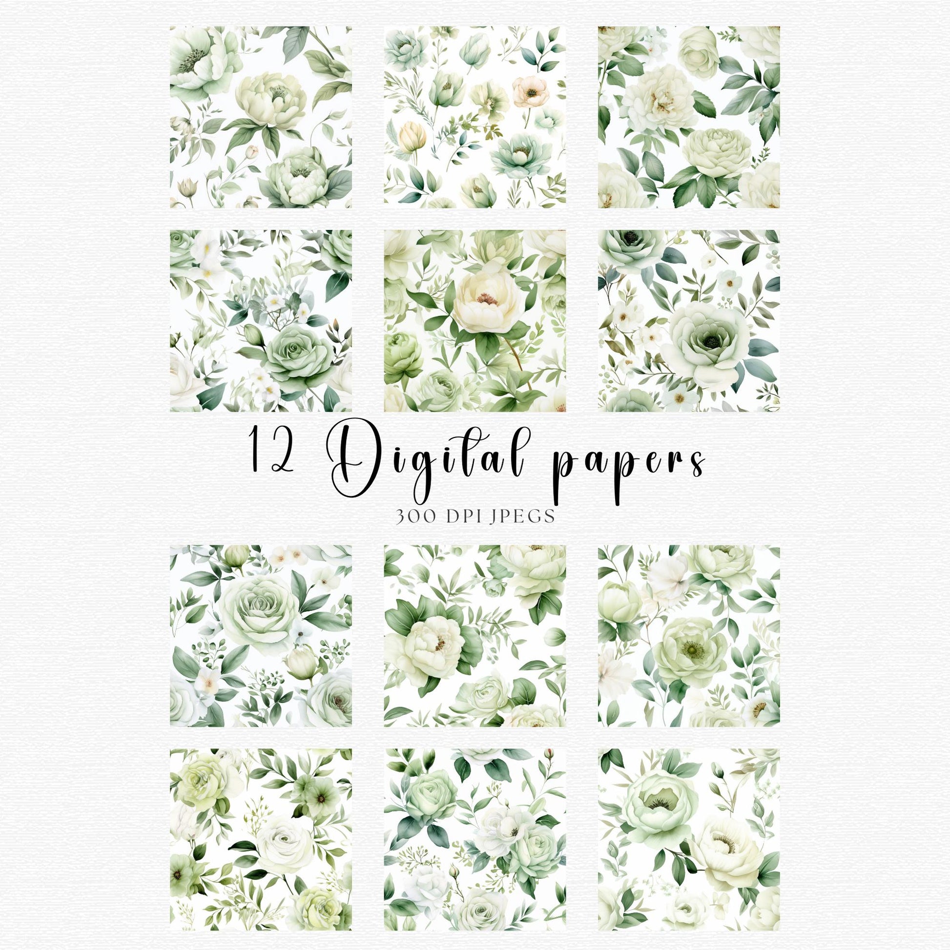 Dale un toque de elegancia y belleza natural a tus diseños con este impresionante paquete de papeles digitales de rosas y peonías verde salvia. Estas flores de acuarela son perfectas para añadir un toque suave y romántico a tus proyectos. Con delicadas rosas entrelazadas con exuberantes peonías verde salvia, este set es ideal para bodas, diseños de sublimación, invitaciones, scrapbooking y mucho más.