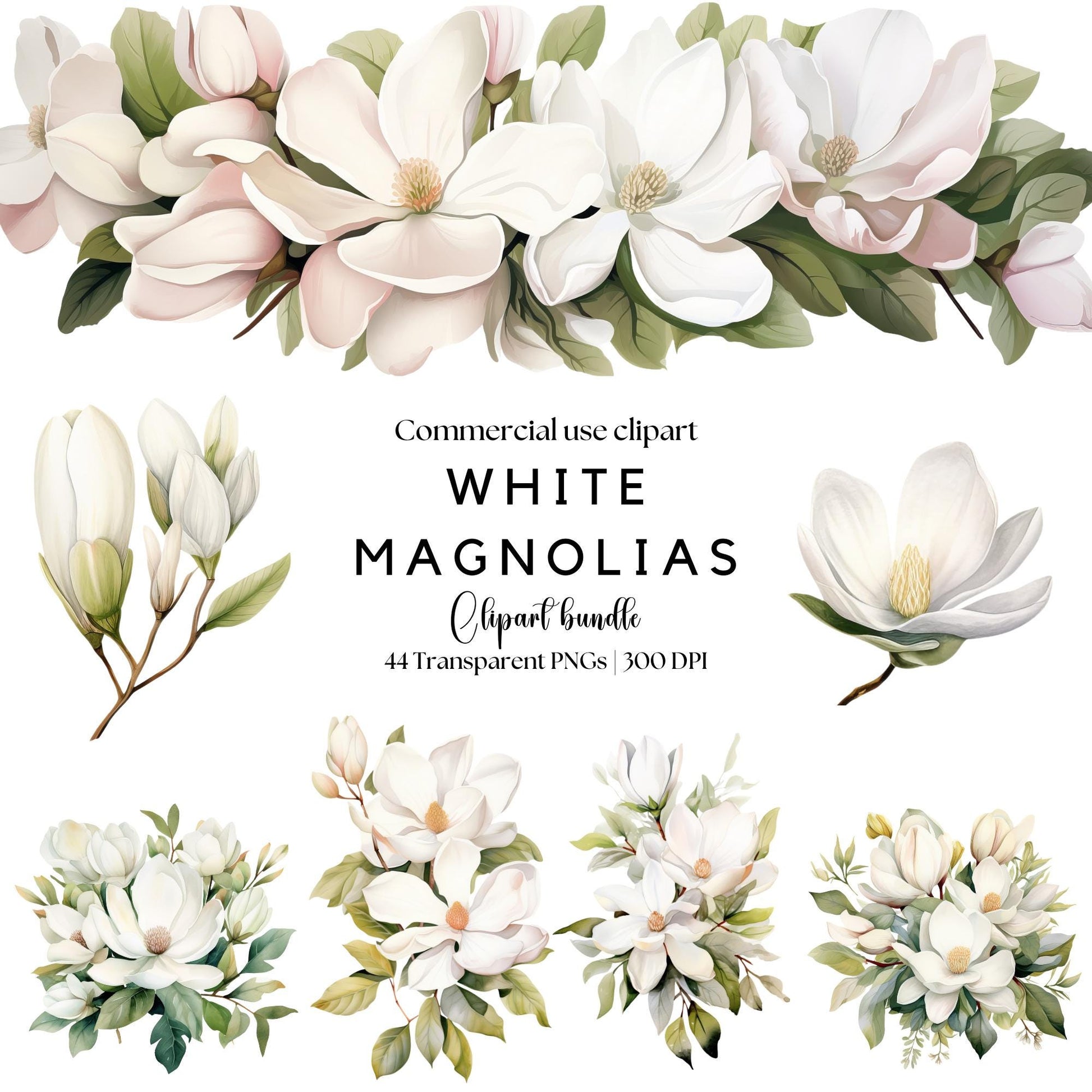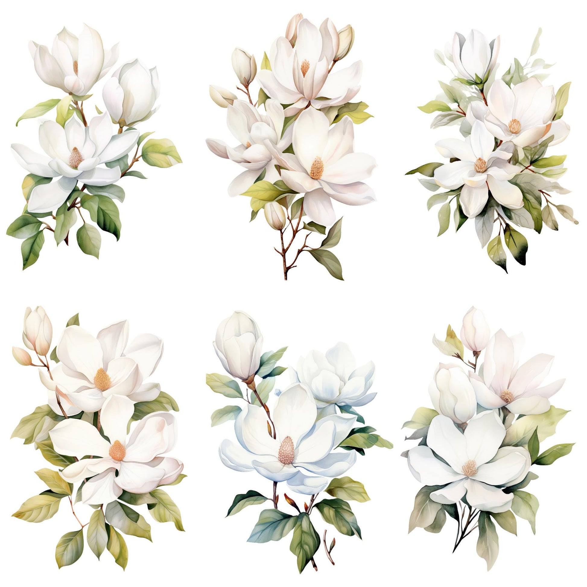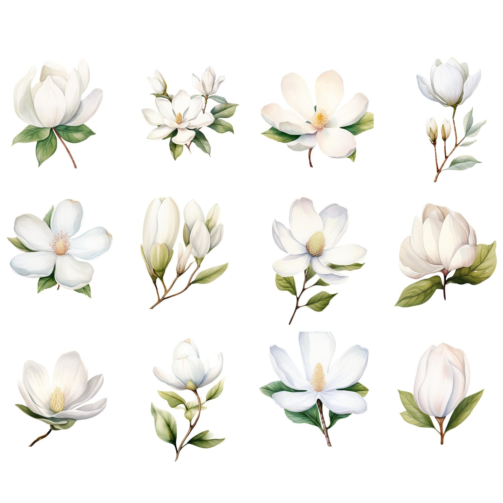 Dale un toque de elegancia a tus proyectos creativos con nuestra colección de cliparts florales de magnolia blanca. Perfectas para invitaciones de boda, tarjetas de felicitación y más, estas magnolias en acuarela están diseñadas para aportar un toque sofisticado a tus diseños.