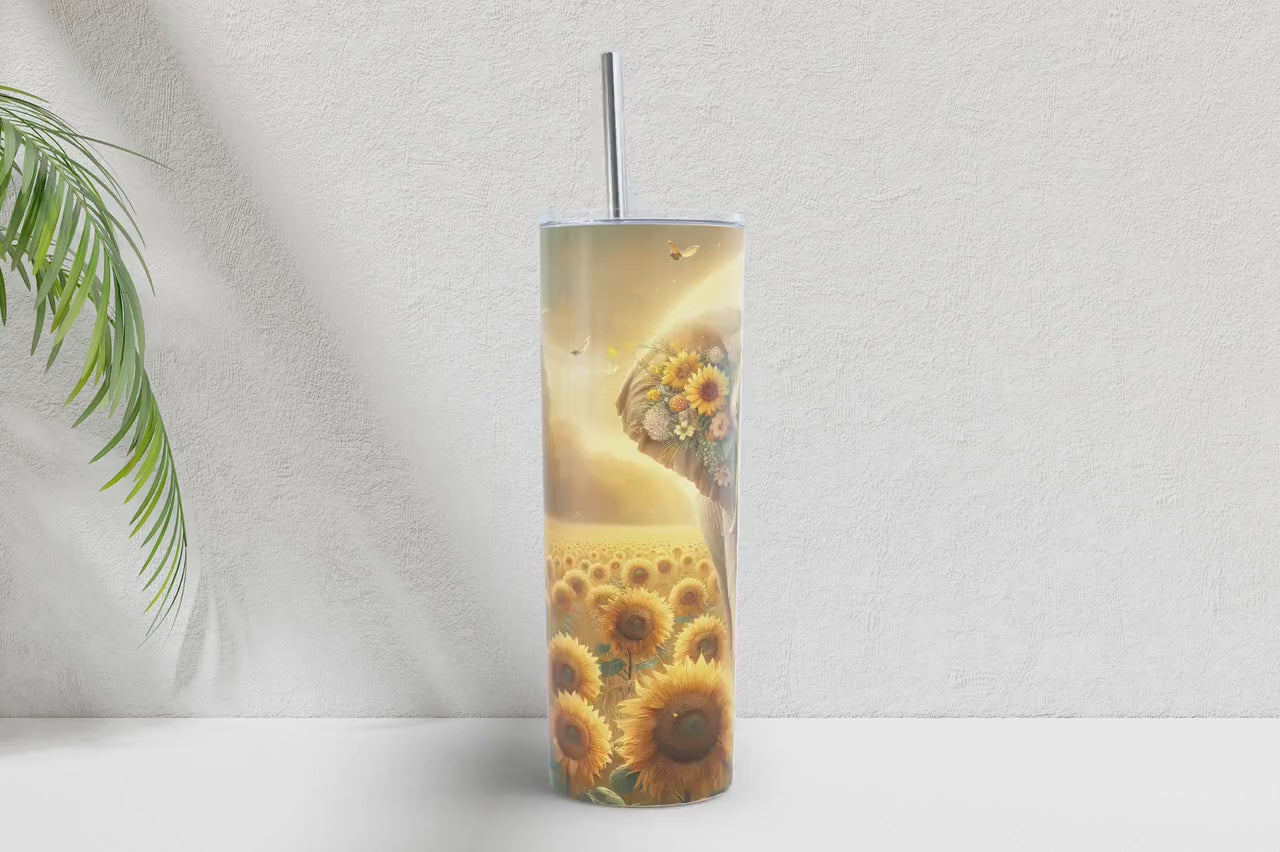Infuse your drinkware with boho elegance through our "Elephant with Sunflowers Tumbler Wrap." This 20 oz Skinny Tumbler Sublimation Design beautifully combines the grace of an elephant with vibrant sunflowers and intricate mandalas, creating a stunning boho jungle theme that's perfect for nature lovers.