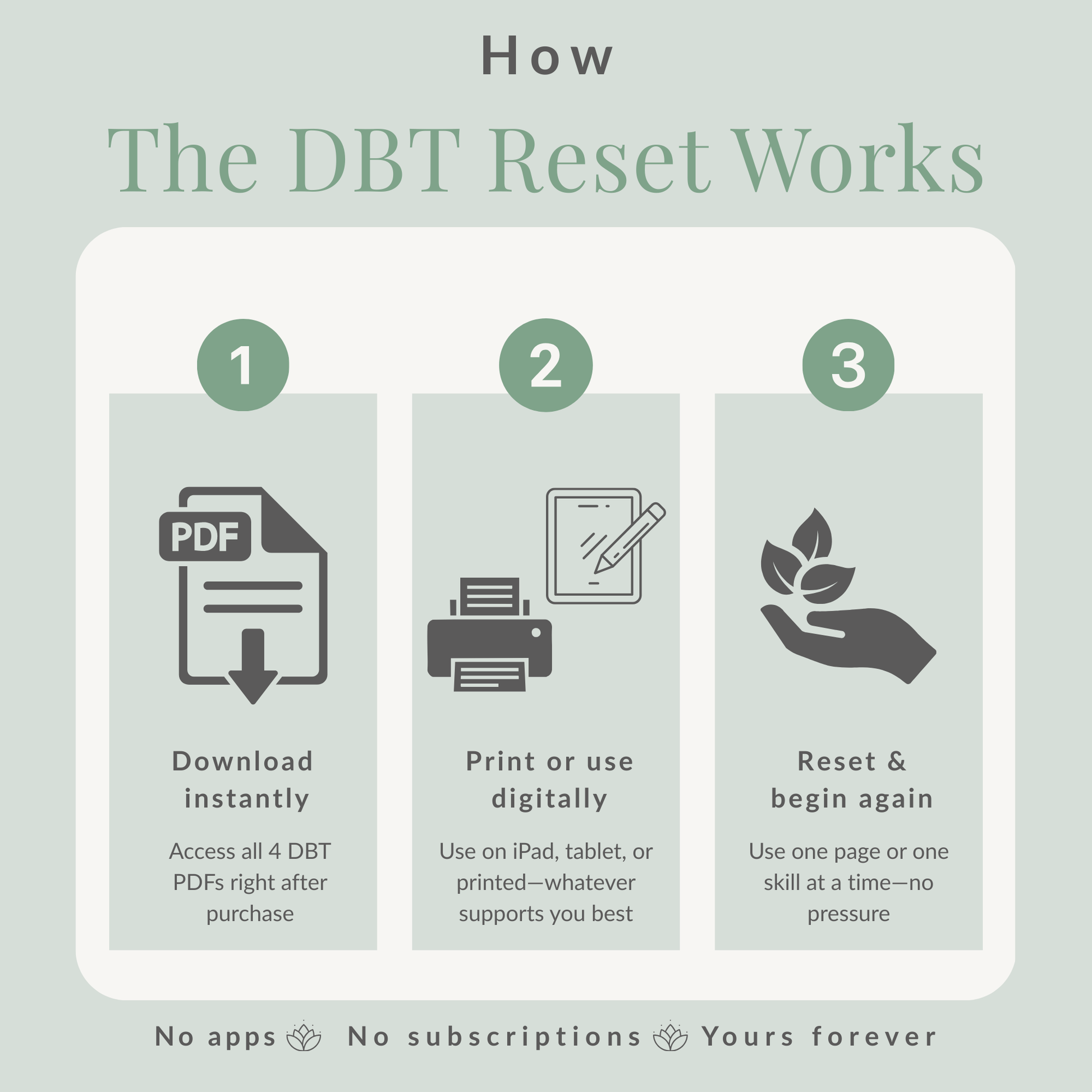 The DBT Reset Bundle is a gentle, practical toolkit designed to help you regulate emotions, manage overwhelm, and build healthier coping skills — without pressure or perfection.