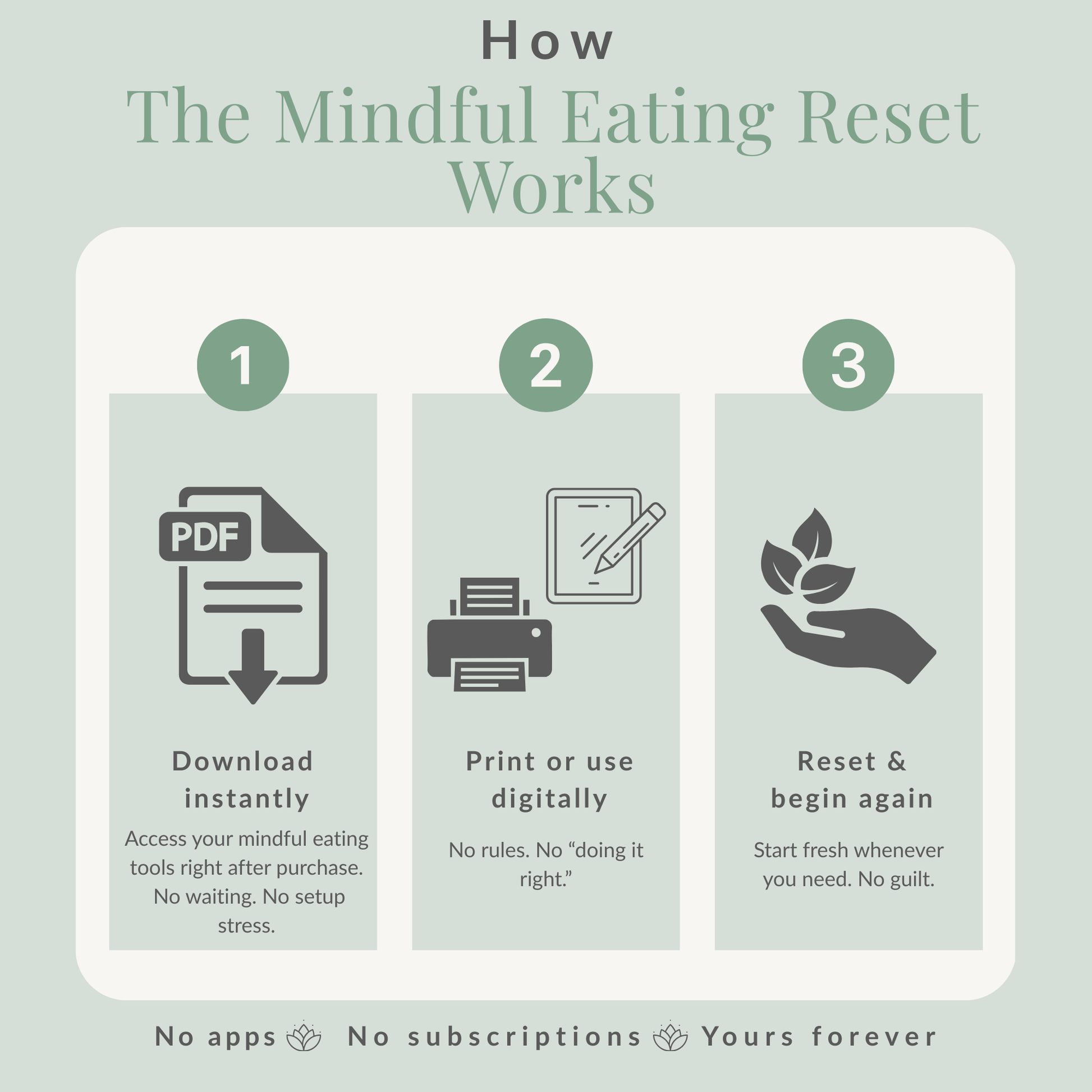 Inside, you’ll find 2 core mindful eating tools to guide your mindset and daily practice, plus 3 supportive bonus tools to gently reinforce your reset when you need extra support.